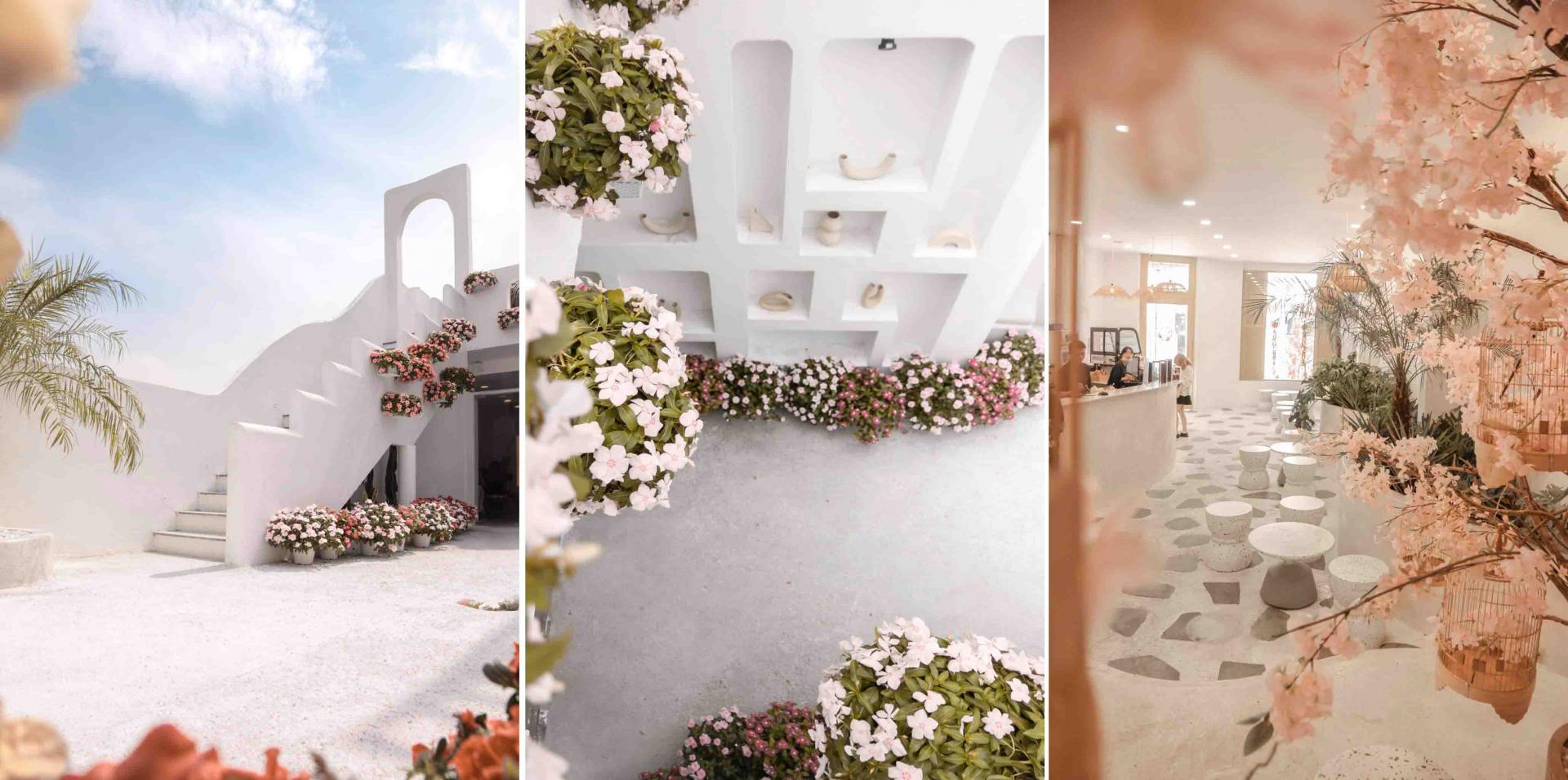 Le Ciel Café lấy cảm hứng từ vùng Santorini của Hy Lạp. Sắc xanh cùng màu trắng tinh khiết là gam màu chủ đạo của quán, tạo nên một không gian tươi mát như đại dương. Trong dịp Tết này, Le Ciel còn kết hợp thêm những chi tiết mang hơi thở của mùa Xuân Việt Nam, từ hoa đào, bánh chưng đến những bao lì xì đỏ, tạo nên một sự pha trộn độc đáo.